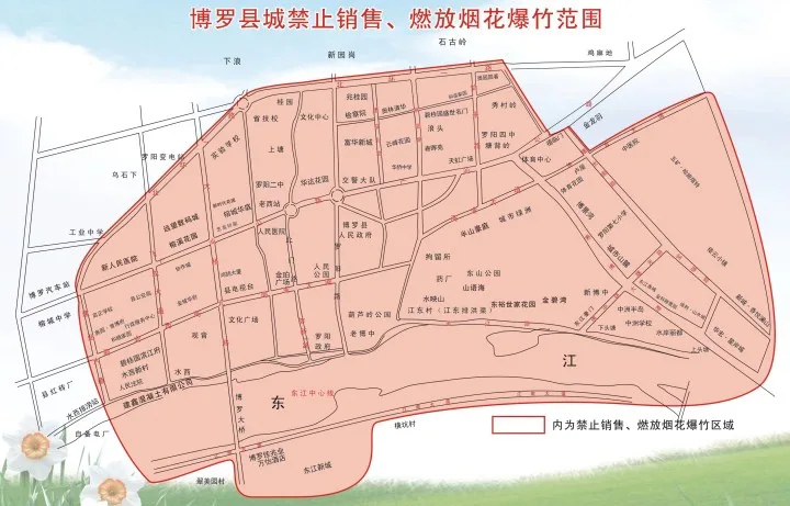 博羅縣方面,在縣城東江南岸沙灘至江南大道博羅段內(nèi)側(cè)范圍內(nèi),農(nóng)歷除夕、正月初一全天,正月初二、初三和元宵節(jié)的8時(shí)至23時(shí)可燃放煙花爆竹,其他時(shí)間禁止燃放。