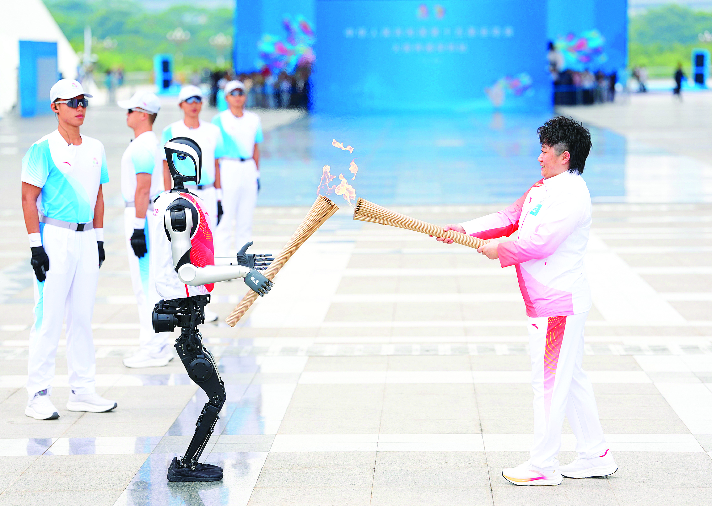 11月2日,于洋(右)與火炬手人形機(jī)器人“夸父”在火炬?zhèn)鬟f中。當(dāng)日,中華人民共和國第十五屆運(yùn)動會火炬?zhèn)鬟f深圳站舉行。 新華社發(fā)