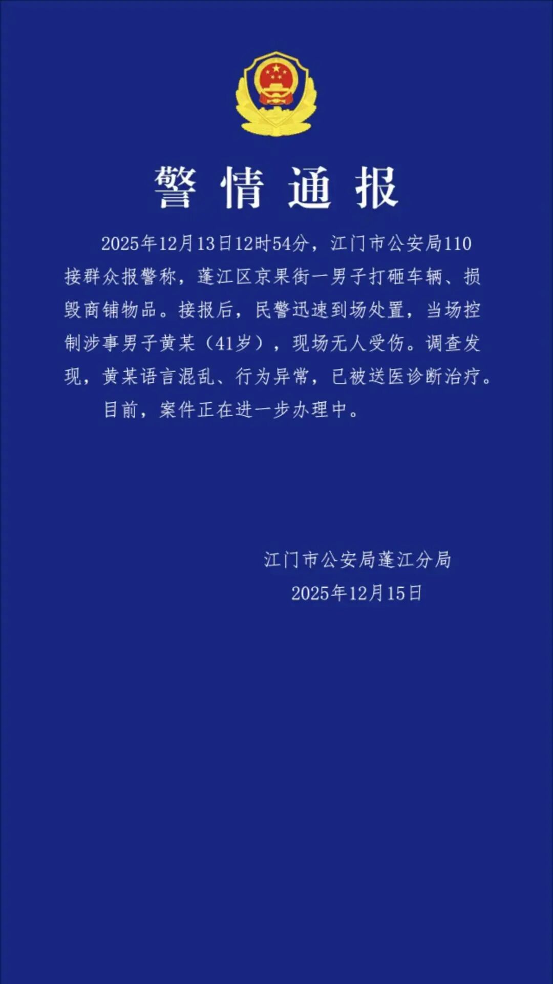 12月15日晚上,廣東省江門市公安局蓬江分局發(fā)布警情通報稱: