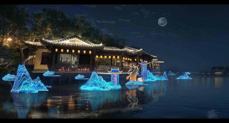 燈組“千年之約”場景設(shè)計來源于蘇東坡寓惠兩年多對惠州巨大的貢獻(xiàn),充分利用東坡、朝云、亭山樓閣等元素,營造出“天上宮闕”般的場景,如夢如幻仿佛穿越時空回到一千年前,與東坡有個跨越時空的約定。