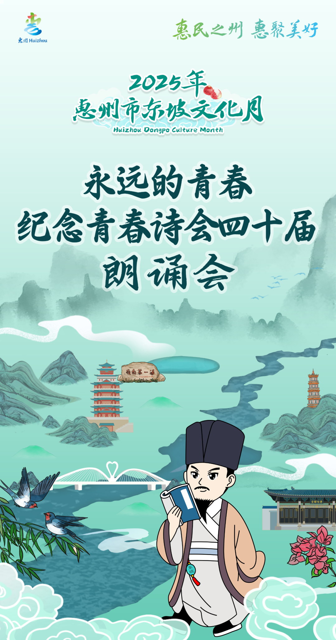 1月13-14日,“惠聚美好·青春詩會”將邀請60余名詩人代表來惠尋跡東坡,通過朗誦會、采風頌等活動,來一場“詩酒趁年華”的詩詞盛會;