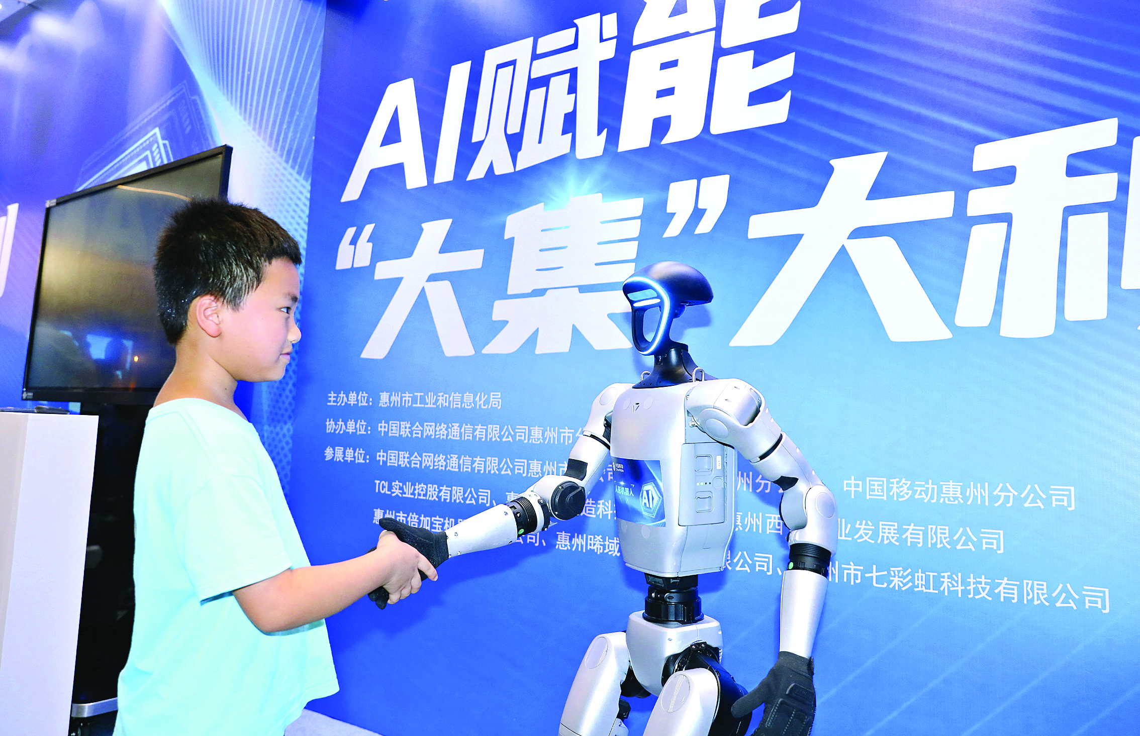 “AI賦能‘大集’大利”活動(dòng)現(xiàn)場(chǎng)小朋友與機(jī)器人互動(dòng)。