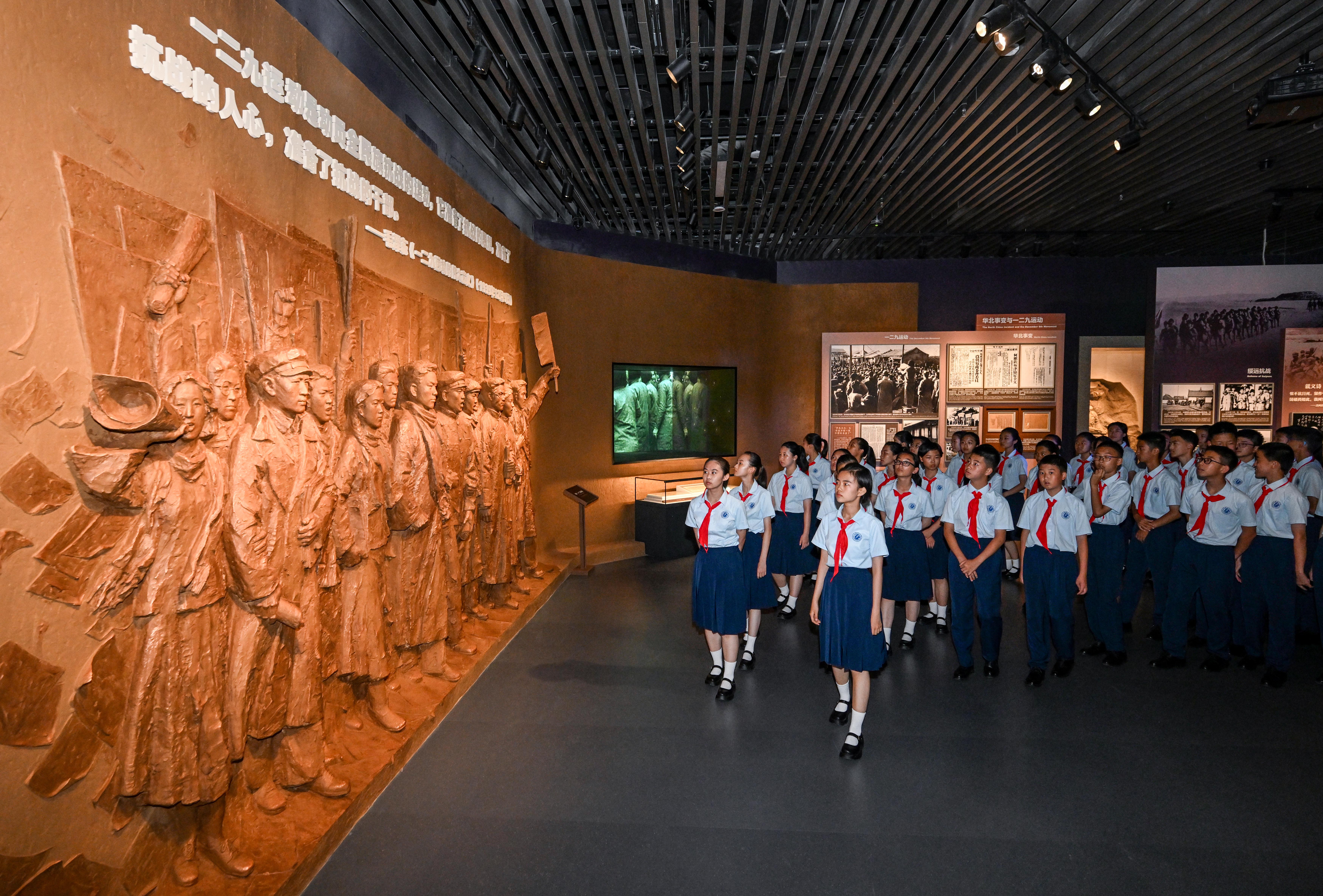7月7日上午,紀(jì)念全民族抗戰(zhàn)爆發(fā)88周年儀式暨《為了民族解放與世界和平》主題展覽開幕式在中國(guó)人民抗日戰(zhàn)爭(zhēng)紀(jì)念館舉行。這是北京市第十二中學(xué)的少先隊(duì)員參觀主題展覽。新華社發(fā)