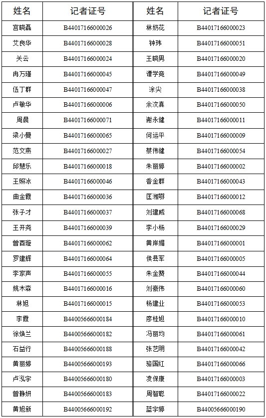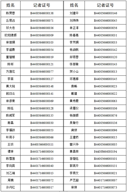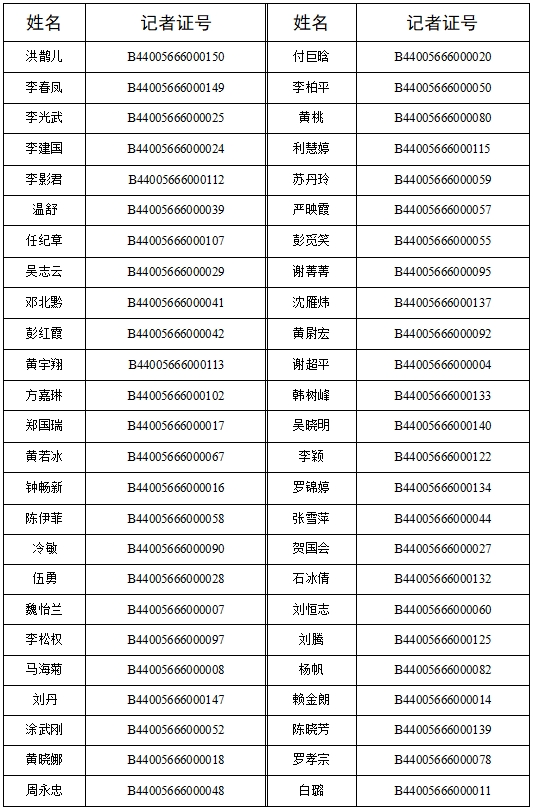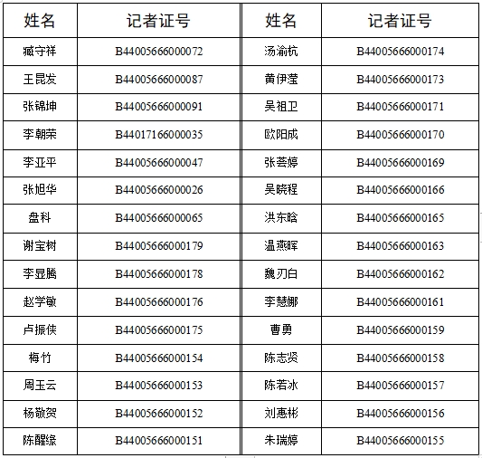 根據(jù)《新聞?dòng)浾咦C管理辦法》的有關(guān)規(guī)定,按照《國(guó)家新聞出版署關(guān)于開(kāi)展2023年度新聞?dòng)浾咦C核驗(yàn)工作的通知》、《廣東省新聞出版局關(guān)于開(kāi)展2023年度新聞?dòng)浾咦C核驗(yàn)工作的通知》精神,我社對(duì)通過(guò)2023年度新聞?dòng)浾咦C核驗(yàn)人員名單(包括惠州日?qǐng)?bào)134人和東江時(shí)報(bào)53人,共計(jì)187人)進(jìn)行公示,名單如下: