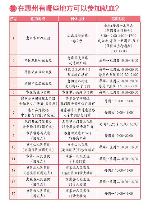 如有需要,也可以拔打電話:0752-2818708,惠州市中心血站將為您匹配最近的獻(xiàn)血點(diǎn)。
