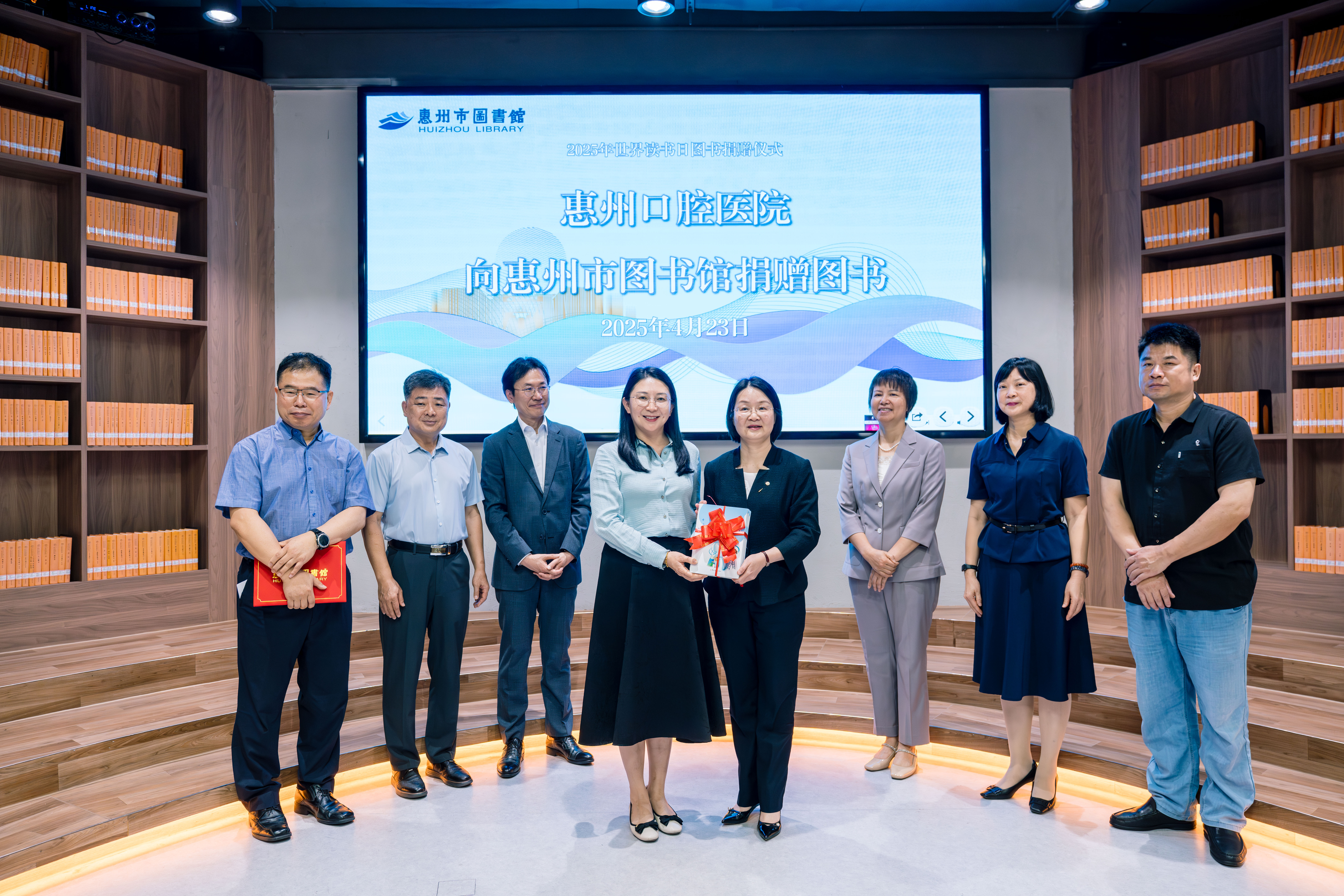 捐書儀式在惠州市圖書館一樓惠享書房順利舉行,惠州口腔醫(yī)院代表與圖書館工作人員等共同見證了這一溫馨時(shí)刻。