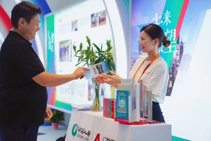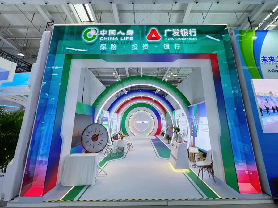 走進(jìn)展廳,小小的接待臺(tái)儼然變成了一個(gè)“銀行窗口”,廣發(fā)銀行信用卡、零售信貸、養(yǎng)老金、跨境人民幣等業(yè)務(wù)宣傳資料一應(yīng)俱全,擺放得整整齊齊。隨即進(jìn)入一個(gè)圓形的“通道”之中,一種時(shí)空穿梭的科技感撲面而來。廣發(fā)銀行的工作人員早早來到這里,身著印有“中國人壽-廣發(fā)銀行”logo的T恤,熱情洋溢地為觀眾進(jìn)行解說。展會(huì)現(xiàn)場(chǎng),觀眾們仿佛置身于一個(gè)保銀協(xié)同的金融通道之中,它所象征著一條金融助力實(shí)體經(jīng)濟(jì)、服務(wù)國家發(fā)展的康莊大道。