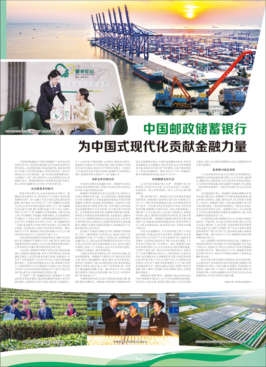 中國(guó)郵政儲(chǔ)蓄銀行(簡(jiǎn)稱“郵儲(chǔ)銀行”)始終堅(jiān)決貫徹落實(shí)黨中央、國(guó)務(wù)院決策部署,堅(jiān)守國(guó)有商業(yè)銀行的責(zé)任使命,以高質(zhì)量黨建引領(lǐng)高質(zhì)量發(fā)展,推進(jìn)黨的領(lǐng)導(dǎo)與完善公司治理有機(jī)融合,把黨的領(lǐng)導(dǎo)這一政治優(yōu)勢(shì)轉(zhuǎn)化為公司治理效能。基于自身的資源稟賦優(yōu)勢(shì),立足服務(wù)“三農(nóng)”、城鄉(xiāng)居民和中小企業(yè)的特色定位,郵儲(chǔ)銀行走出一條特色鮮明的大型零售商業(yè)銀行發(fā)展之路,以特色金融服務(wù)全方位助力中國(guó)式現(xiàn)代化。