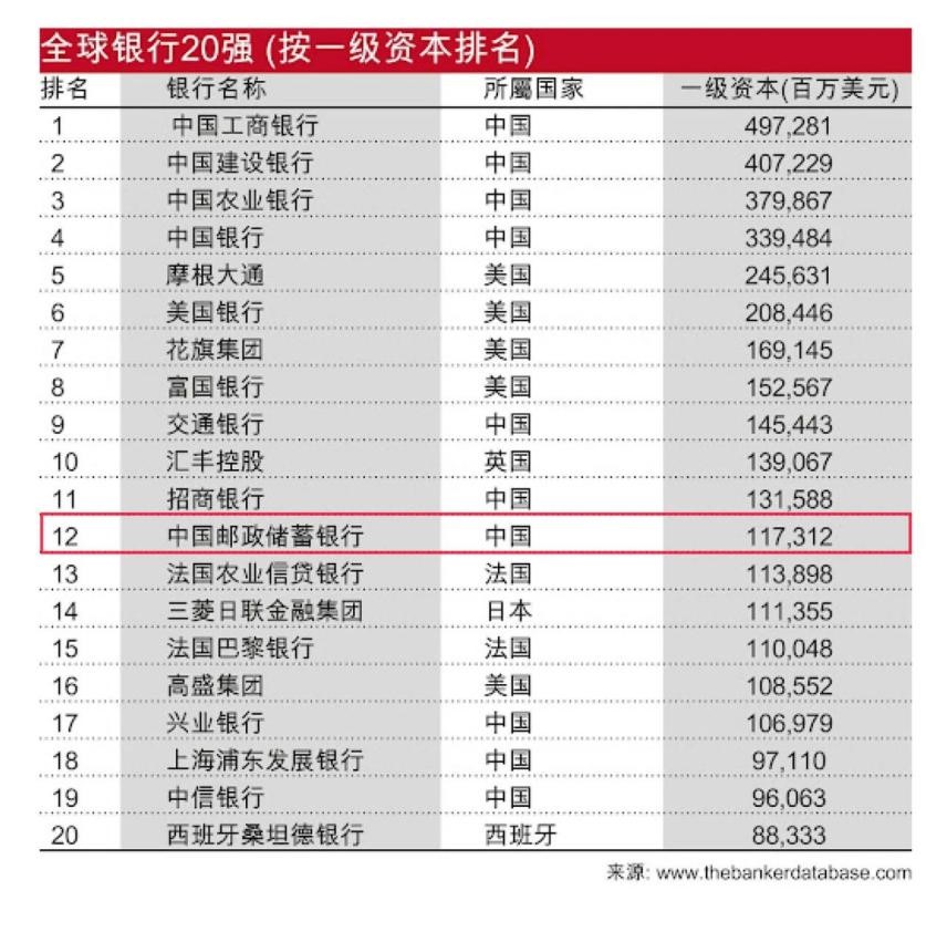 7月5日,英國(guó)《銀行家》雜志(The Banker)發(fā)布了“2023年全球銀行1000強(qiáng)”榜單,中國(guó)郵政儲(chǔ)蓄銀行以2022年末一級(jí)資本1173.12億美元位列第12位,較去年上升1位,連續(xù)3年進(jìn)入全球20強(qiáng)。