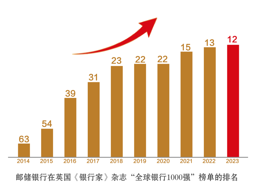 英國(guó)《銀行家》雜志自1970年以來,每年發(fā)布“全球銀行1000強(qiáng)”榜單。該排名基于一級(jí)資本等衡量銀行實(shí)力的關(guān)鍵指標(biāo),對(duì)全球銀行進(jìn)行排名,從而反映全球銀行業(yè)實(shí)力的變化。郵儲(chǔ)銀行2023年在“全球銀行1000強(qiáng)”榜單中一級(jí)資本的排名,較2014年首次參加排名時(shí)的63位大幅上升51位。