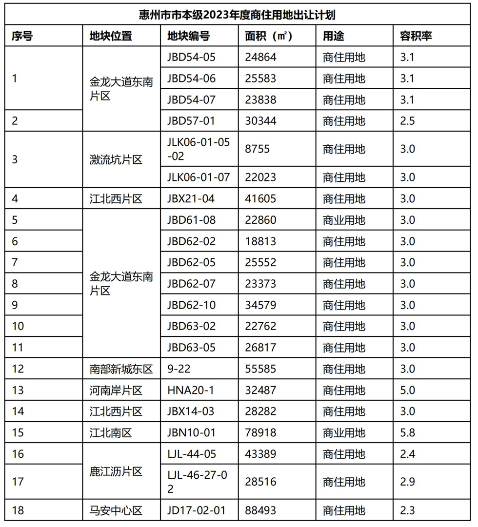 惠州日報訊 (記者邱若蓉 通訊員陳佛良)當(dāng)前,隨著房地產(chǎn)相關(guān)利好政策不斷出臺,惠州樓市正穩(wěn)步復(fù)蘇,拿地、拿好地成為各家房地產(chǎn)公司發(fā)力重點。4月10日,惠州市自然資源局發(fā)布《惠州市市本級2023年度商住用地出讓計劃》,惠州市本級今年計劃推出21宗商住用地,面積規(guī)模共計約70.74萬平方米。