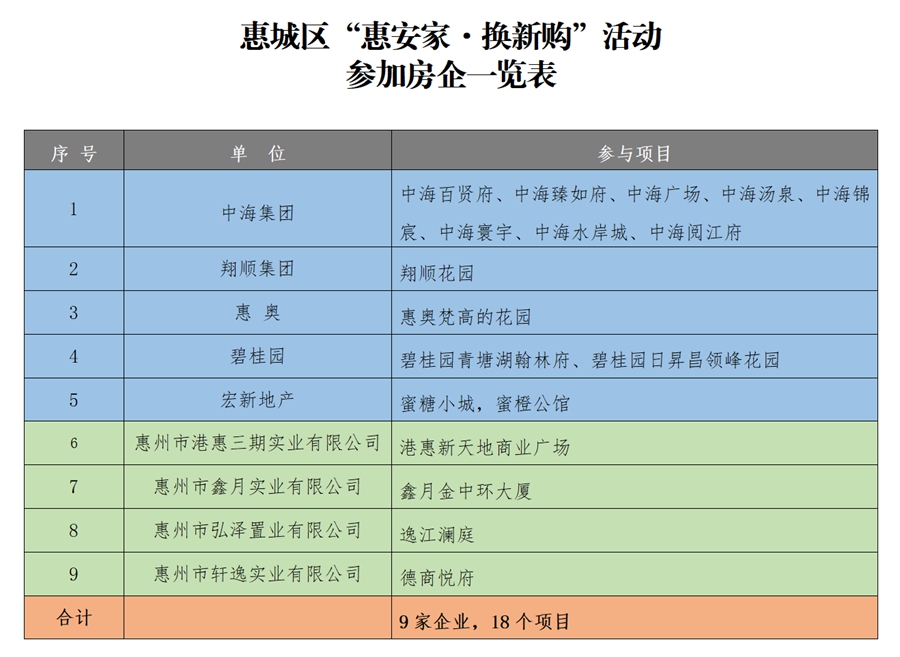 目前“換新購”已開通購房報(bào)名方式,詳情可關(guān)注惠州市房地產(chǎn)業(yè)協(xié)會(huì)、惠州市房地產(chǎn)中介行業(yè)協(xié)會(huì)的相關(guān)網(wǎng)站、微信公眾號。