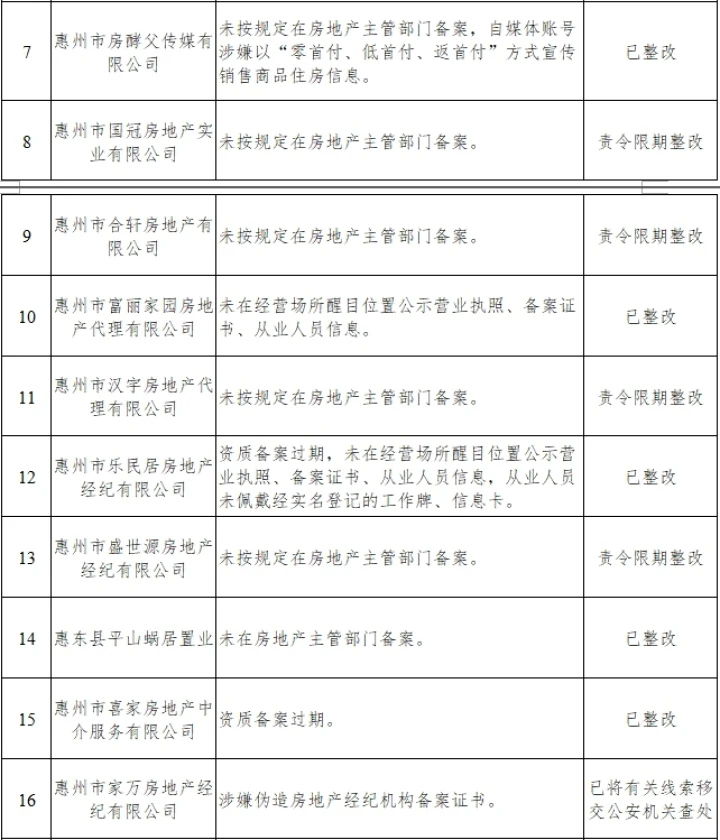 目前,部分涉嫌違規(guī)的行為已經(jīng)完成整改,部分被責(zé)令限期整改。惠州市家萬房地產(chǎn)經(jīng)紀(jì)有限公司涉嫌偽造房地產(chǎn)經(jīng)紀(jì)機構(gòu)備案證書,有關(guān)線索已被移交公安機關(guān)進(jìn)行查處。