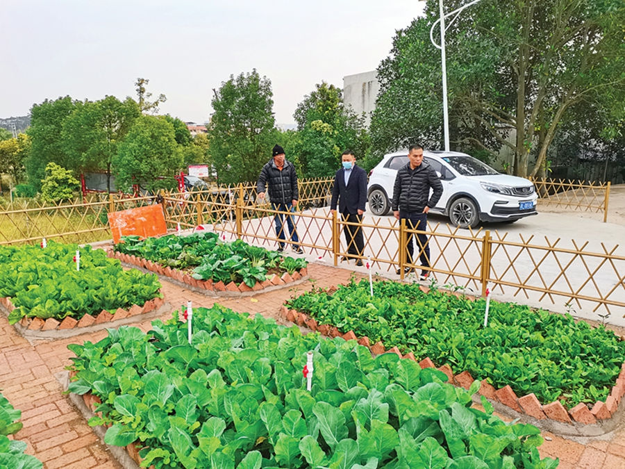 溫運紅(左一)檢查“四小園”建設工作。