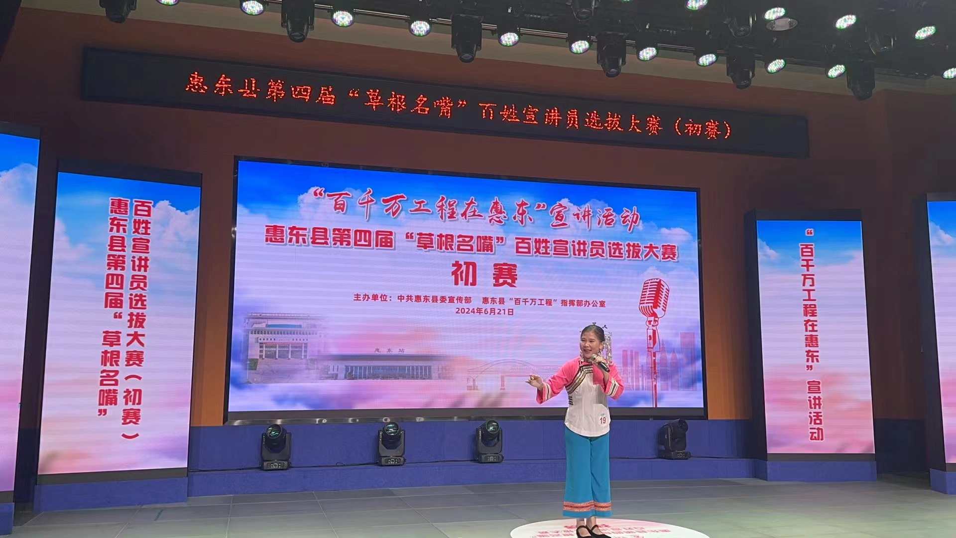 近日,惠東縣第四屆“草根名嘴”百姓宣講員選拔暨“百千萬工程在惠東”宣講活動(dòng)火熱進(jìn)行。活動(dòng)現(xiàn)場,來自各鎮(zhèn)(街、度假區(qū)、旅游區(qū))黨(工)委和縣直、駐惠東有關(guān)單位的26名選手,通過生動(dòng)的語言和感人的故事,展示自己對(duì)于“百千萬工程在惠東”的理解和感悟,傳遞社會(huì)正能量。經(jīng)過激烈角逐,16名選手晉級(jí),決賽將于7月12日進(jìn)行。
