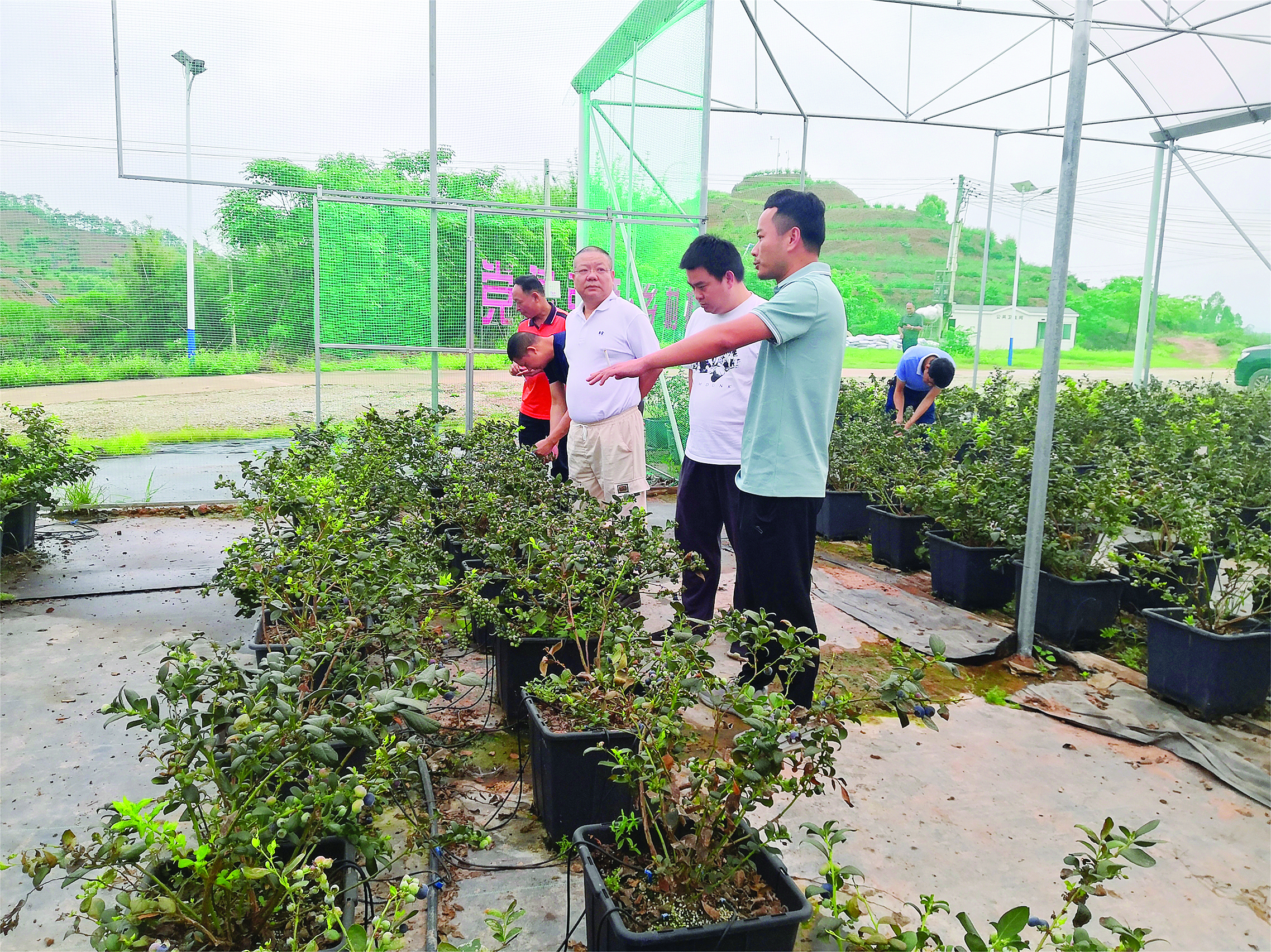 2024年4月,駐觀音閣鎮(zhèn)幫鎮(zhèn)扶村工作隊在天藝藍(lán)莓莊園了解藍(lán)莓掛果情況。