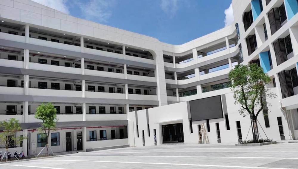 學(xué)校占地面積約3.3萬平方米,總建筑面積約3.2萬平方米,辦學(xué)規(guī)模36個(gè)教學(xué)班。校內(nèi)由6棟教學(xué)樓、一棟雙層體育館組成,各個(gè)教學(xué)樓功能分明,分布小學(xué)部和初中部、行政樓、實(shí)驗(yàn)樓等。學(xué)校建筑以灰白色為主色調(diào),不同功能的教學(xué)樓,點(diǎn)綴橙、藍(lán)、綠等不同顏色。