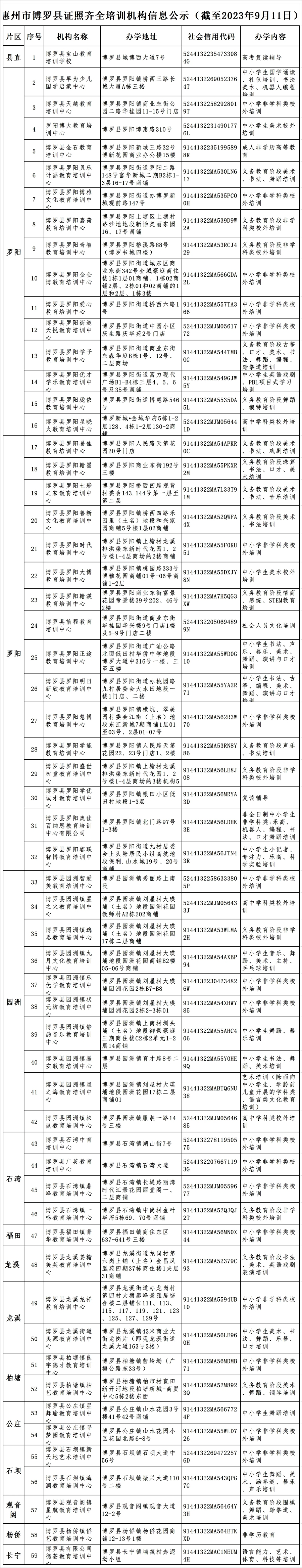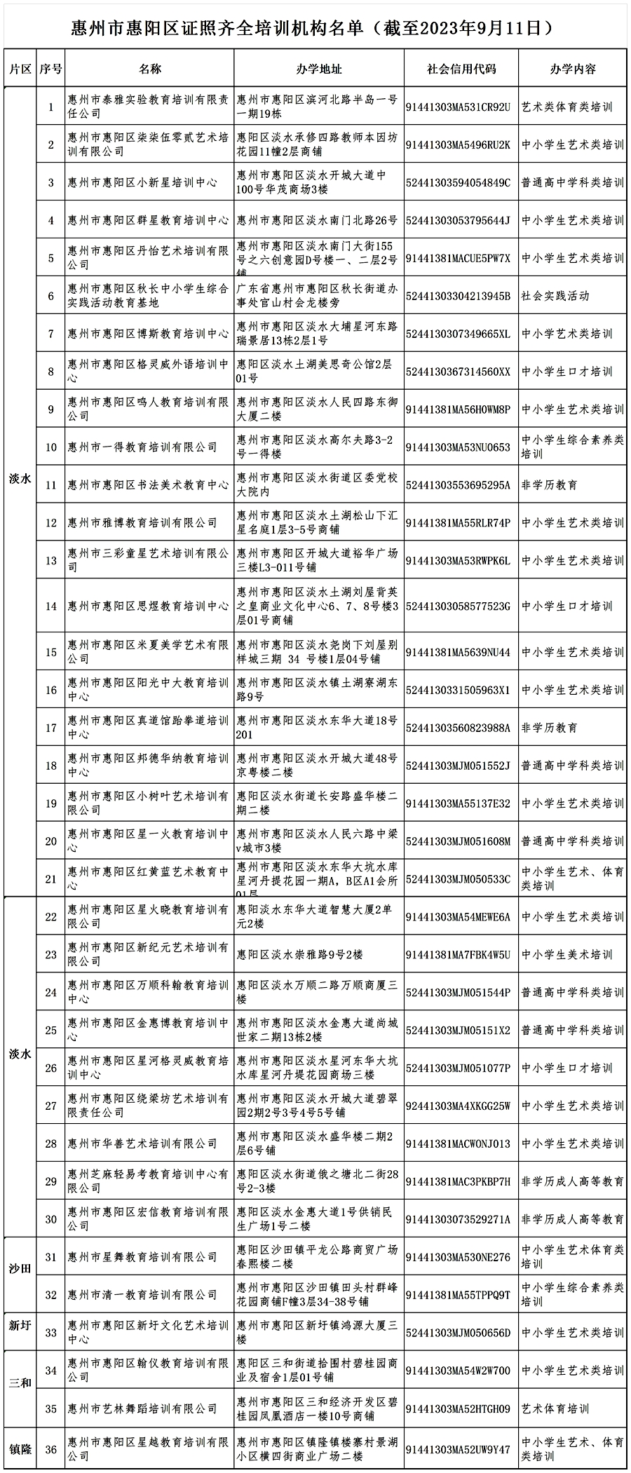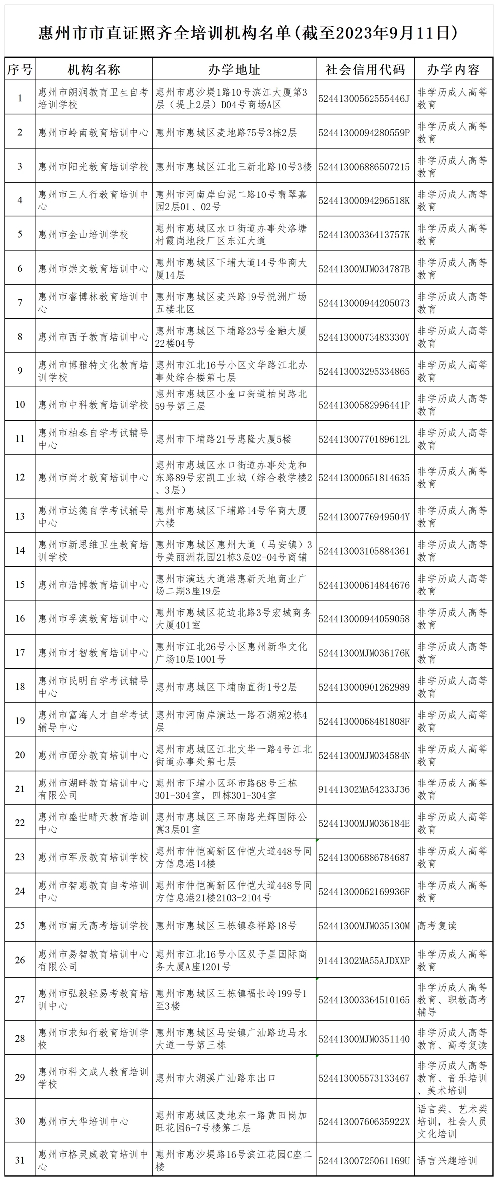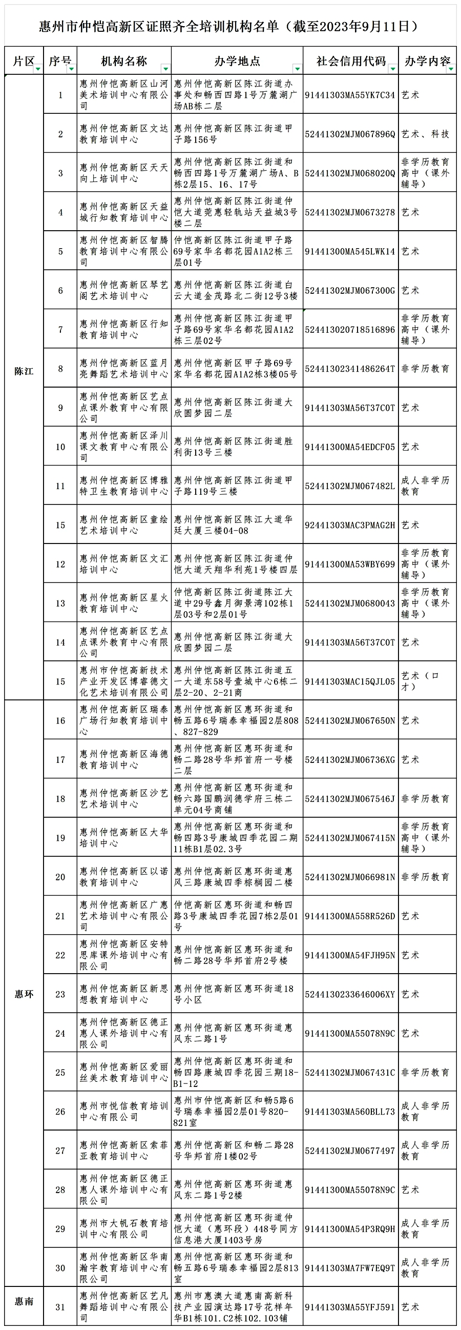 為進(jìn)一步鞏固我市“雙減”工作成果,方便廣大學(xué)生及家長(zhǎng)查詢和選擇合法合規(guī)教育培訓(xùn)機(jī)構(gòu),9月18日,惠州市教育局發(fā)布《關(guān)于公布惠州市證照齊全培訓(xùn)機(jī)構(gòu)名單的公告》,公布我市由教育行政部門審批監(jiān)管的證照齊全培訓(xùn)機(jī)構(gòu)名單(截至2023年9月11日)。