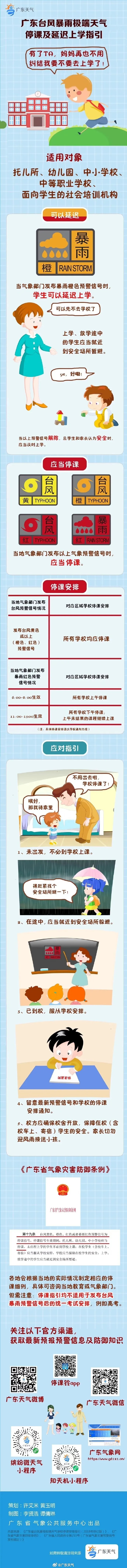 按照《廣東省氣象災(zāi)害防御條例》的規(guī)定,當(dāng)氣象部門發(fā)布臺(tái)風(fēng)黃色、橙色、紅色預(yù)警信號(hào)和暴雨紅色預(yù)警信號(hào),可視為停課信號(hào)。停課適用范圍:托兒所、幼兒園、中小學(xué)校、中等職業(yè)學(xué)校。