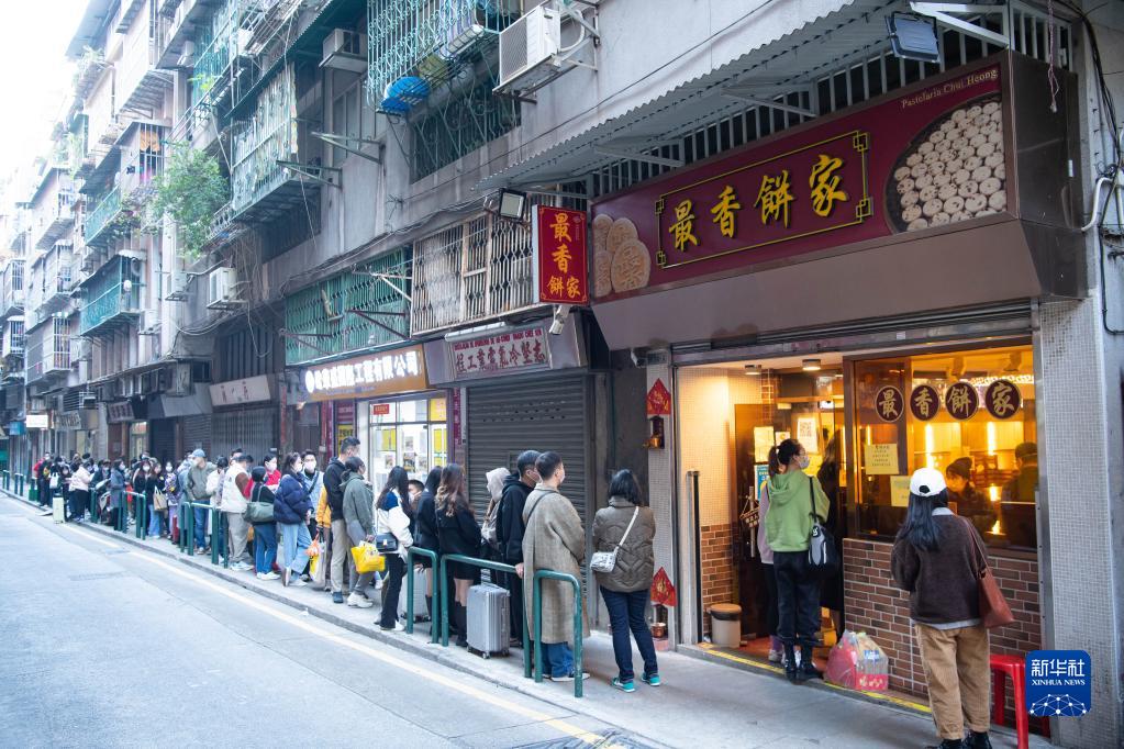 1月18日,游客在澳門“最香餅家”店外排隊(duì)購(gòu)買手工炭燒杏仁餅。新華社記者 張金加 攝