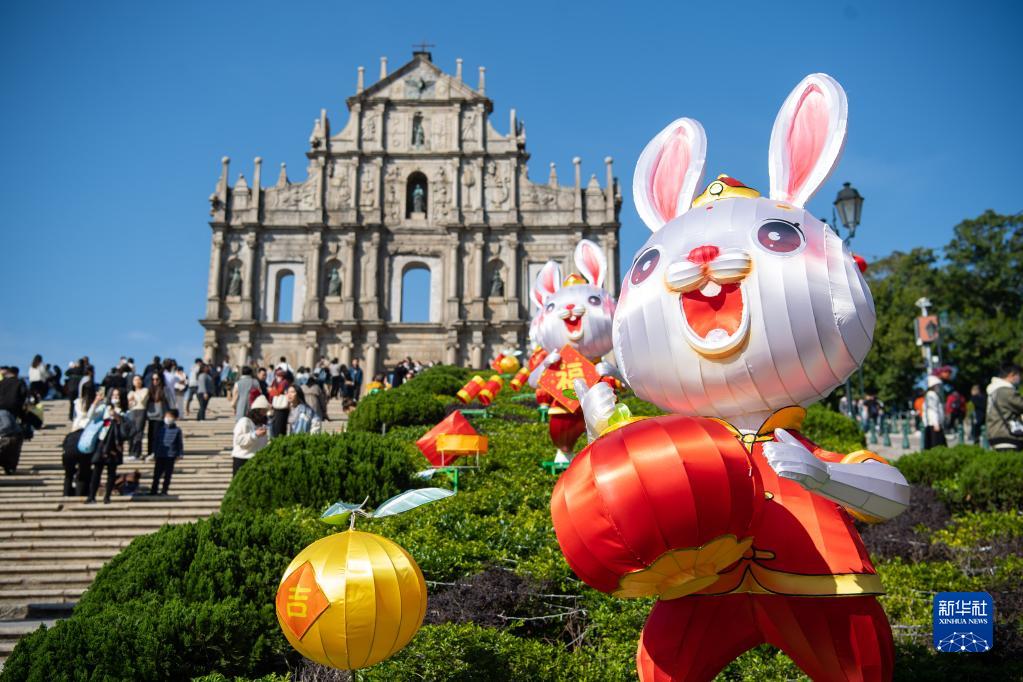 大三巴、官也街、媽閣廟……澳門的熱門旅游地標(biāo)處水泄不通。大三巴牌坊前,五只身穿賀年服飾的“玉兔”迎客,與牌坊互相輝映,參觀的人群幾乎站滿了每級(jí)臺(tái)階。