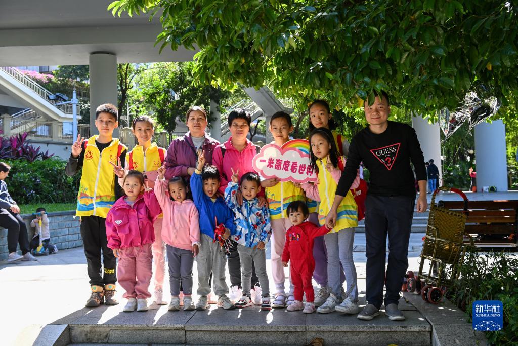 11月18日,在深圳羅湖區(qū)洪湖公園,深港兒童議事會(huì)的小議事員們向居民宣講后留影。新華社記者毛思倩攝
