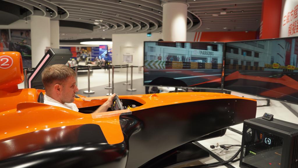 12月16日,參訪團(tuán)成員吳雨翔體驗(yàn)三級方程式模擬駕駛器。新華社發(fā)