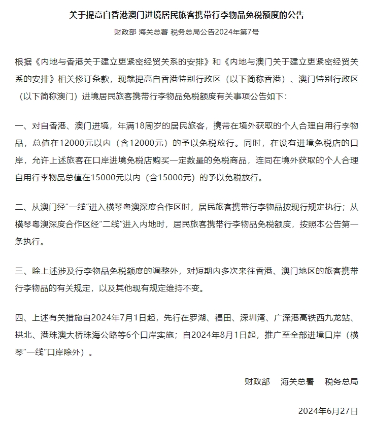 商務(wù)部28日對外公布,內(nèi)地與香港、內(nèi)地與澳門在《關(guān)于建立更緊密經(jīng)貿(mào)關(guān)系的安排》(CEPA)機(jī)制下經(jīng)過磋商,同意提高自香港、澳門進(jìn)境居民旅客攜帶行李物品免稅額度,相關(guān)內(nèi)容納入《CEPA貨物貿(mào)易協(xié)議》。具體措施由業(yè)務(wù)主管部門對外公布實(shí)施。