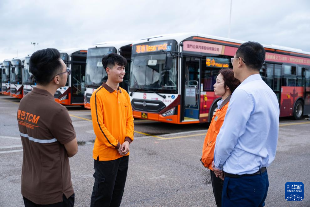 11月14日,澳巴車(chē)長(zhǎng)林宏豪(左二)與同事聊天。新華社發(fā)(張金加攝)