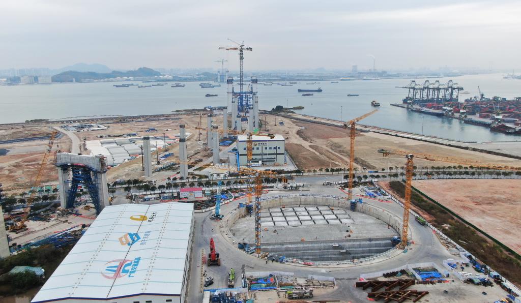 在珠江口東岸的東莞沙田鎮(zhèn)的施工現(xiàn)場,獅子洋大橋的東主塔正進入主塔橫梁施工階段。建設(shè)者們有的在焊接鋼筋,有的在吊運材料。12根引橋墩柱成對排列,勾勒出平滑優(yōu)美的弧線,向遠處直徑127米的超大錨碇延伸而去。