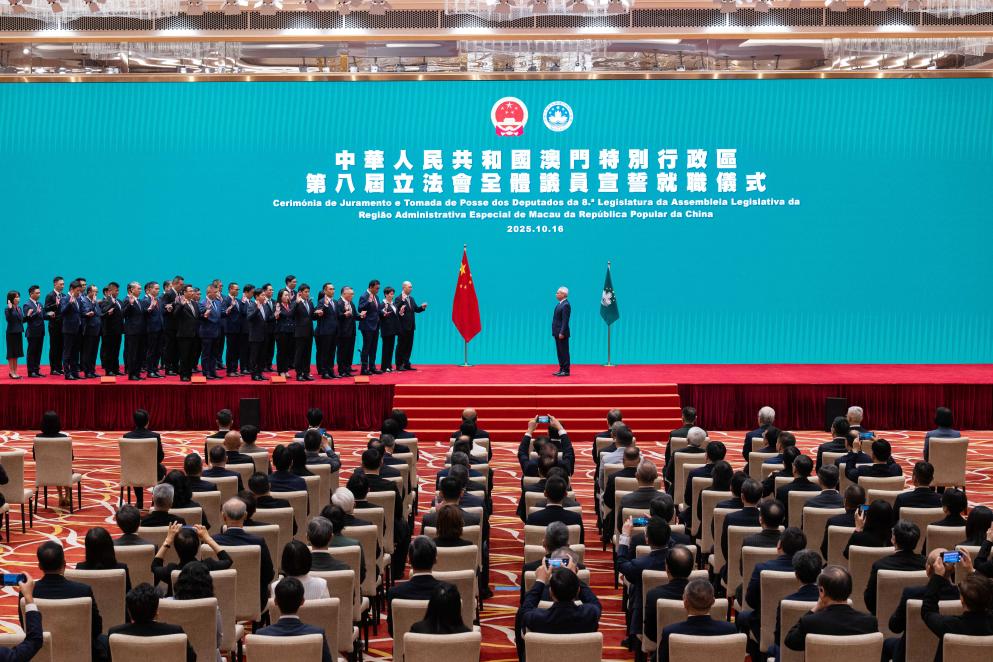 10月16日,在澳門特區(qū)行政長(zhǎng)官岑浩輝(右一)監(jiān)誓下,澳門特區(qū)第八屆立法會(huì)議員宣誓就職。新華社發(fā)(張金加 攝)
