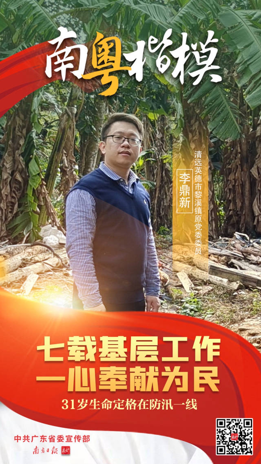 李鼎新生前是英德市黎溪鎮(zhèn)黨委委員,一名“90后”年輕干部。2022年5月11日,李鼎新和兩名同事冒著暴雨前往松柏村開展防汛搶險救災(zāi)工作,在松子壩低水橋處置險情時,突然湍急的水流將車輛沖入河中,李鼎新不幸遇難,年僅31歲。