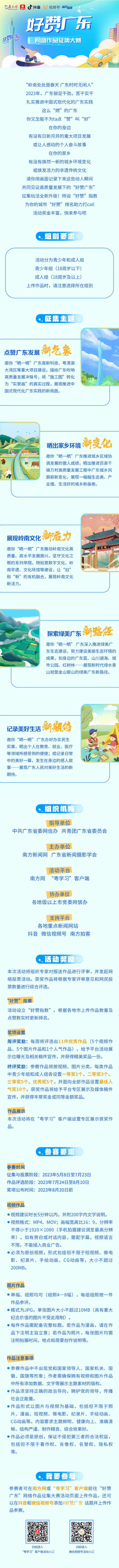活動面向全網(wǎng)征集原創(chuàng)作品,邀請廣大網(wǎng)民從各個角度“曬”出廣東新形象,為廣東點“贊”叫“好”。參賽作品需緊扣“好贊廣東”主題,從宏觀角度展示廣東重大項目、高新科技、大灣區(qū)建設,或是曬出家鄉(xiāng)的嶄新變化、瑰麗多彩的嶺南風情、美不勝收的綠水青山,講好廣東的新時代故事;從微觀角度記錄日常中的偶遇一景、美好一幕,或是自己或身邊人的奮斗經(jīng)歷,展現(xiàn)廣東帶給人們的暖意、愜意和詩意。
