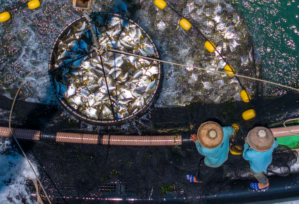 5月27日,在湛江徐聞西連鎮(zhèn),漁業(yè)工人從深海網箱中打撈金鯧魚(無人機照片)。新華社記者 毛思倩 攝