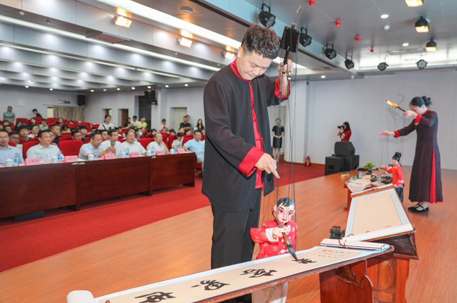 首屆移動杯梅州客家非遺文創(chuàng)設計大賽啟動儀式木偶書法作品展示。吳騰江 攝