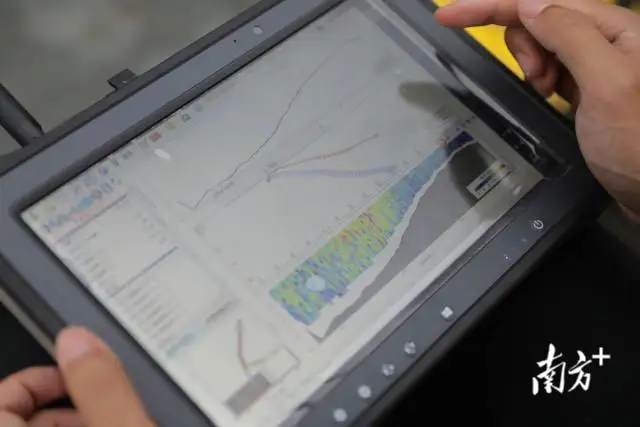 在涌浪之中,測量船向江心駛?cè)ィ阂蝗素?fù)責(zé)掌舵,及時避讓水面上的樹木、竹頭等漂浮物;一人負(fù)責(zé)保護(hù)搭載監(jiān)測設(shè)備的三體船,避免撞船或卷入漩渦;一人負(fù)責(zé)監(jiān)測船載走航式聲學(xué)多普勒流速剖面儀,確保儀器正常工作、數(shù)據(jù)采樣精準(zhǔn)。