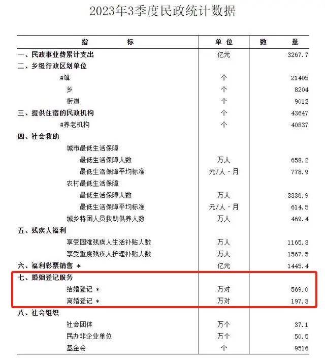 11月10日,民政部網(wǎng)站發(fā)布了《2023年3季度民政統(tǒng)計數(shù)據(jù)》,據(jù)統(tǒng)計,今年前三季度,全國辦理結婚登記為569.0萬對,辦理離婚登記197.3萬對。2022年前三季度,全國共辦理結婚登記544.5萬對,辦理離婚登記164.3萬對。相較而言,今年前三季度結婚登記量較去年同期增加24.5萬對,離婚登記量同比增加33萬對。
