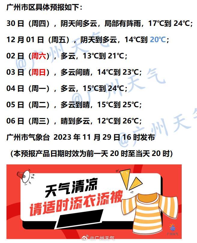 據(jù)中國氣象網(wǎng)消息,今天(11月30日),廣東西部、珠三角等地有小雨來擾,部分地區(qū)有霧,公眾出行請留意交通安全。受冷空氣影響,各地早晚涼意加重,大家請適時(shí)增添衣物。
