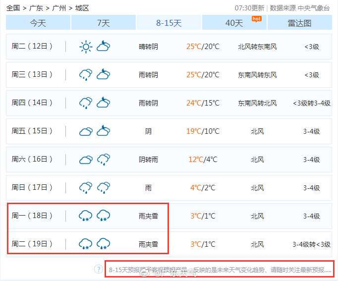 昨天,不少網友從“8-15天趨勢預報”中發(fā)現(xiàn)廣州12月中下旬有雨夾雪。