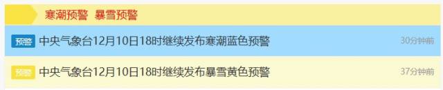 在10日的18時,中央氣象臺繼續(xù)發(fā)布寒潮藍(lán)色預(yù)警和暴雪黃色預(yù)警。