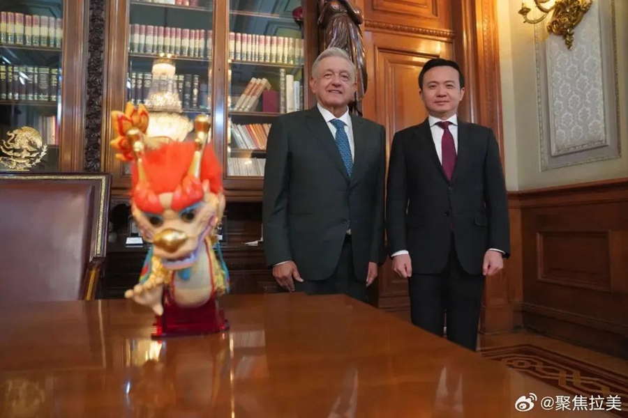 1月31日,駐墨西哥大使張潤赴墨西哥總統(tǒng)府拜會洛佩斯總統(tǒng)。張大使向洛佩斯總統(tǒng)贈送具有濃厚中華優(yōu)秀傳統(tǒng)文化特色的2024年“歡樂春節(jié)”吉祥物——吉祥龍擺件,并祝福墨西哥在新的一年國泰民安、五谷豐登,祝愿中墨關(guān)系再上新臺階。
