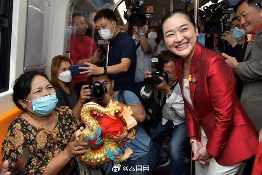 2月2日,中國駐泰國大使韓志強與泰國旅游與體育部長素妲婉、文化部長森薩來到曼谷市中心的鵬蓬輕軌站,向軌道交通公司員工與幸運乘客送出“歡樂春節(jié)”吉祥龍,致以新春的美好祝福。
