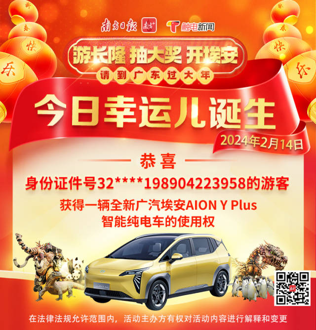 好人啟好運(yùn),最暖是廣東。2月14日19時(shí)許,由南方+、觸電新聞主辦的“請(qǐng)到廣東過大年之游長隆、抽大獎(jiǎng)、開埃安”活動(dòng)繼續(xù)傳遞好運(yùn),開出第六個(gè)大獎(jiǎng)。隨著“中國好人”朱化學(xué)按下開獎(jiǎng)鍵,身份證號(hào)“32****198904223958”鎖定在大屏幕,江蘇游客吳先生將獲得一輛全新廣汽埃安AION Y Plus智能純電車的使用權(quán)。