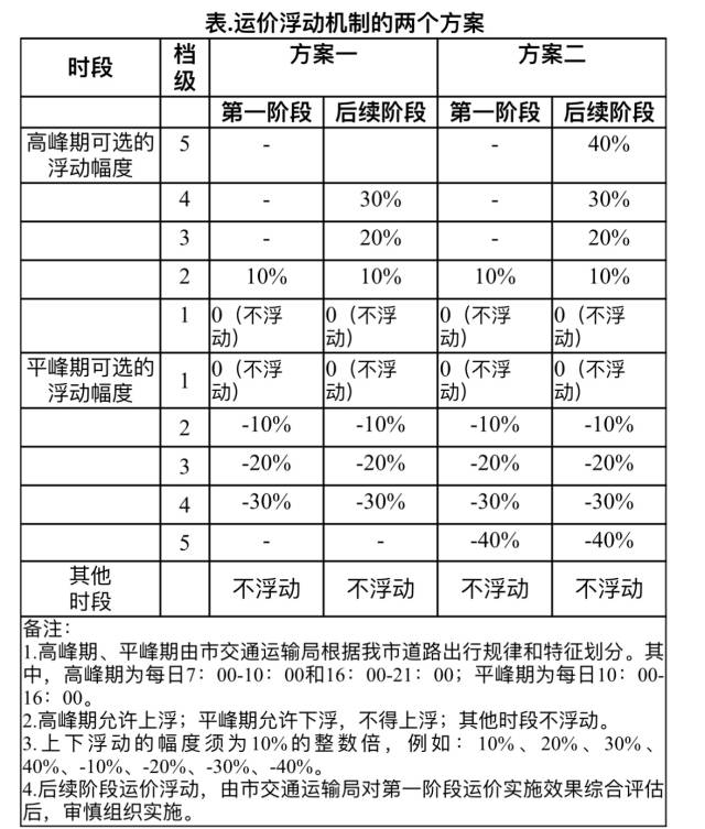浮動(dòng)幅度方面,按高峰期、平峰期可選擇運(yùn)價(jià)浮動(dòng)幅度的大小,提出2個(gè)具體方案,并分階段實(shí)施,逐步擴(kuò)大浮動(dòng)幅度。
