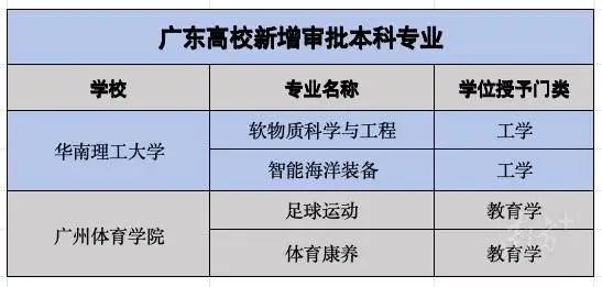 從審批專(zhuān)業(yè)來(lái)看,廣東今年有2所高校新增4個(gè)審批本科專(zhuān)業(yè),分別是華南理工大學(xué)的軟物質(zhì)科學(xué)與工程、智能海洋裝備專(zhuān)業(yè),廣州體育學(xué)院的足球運(yùn)動(dòng)、體育康養(yǎng)專(zhuān)業(yè)。
