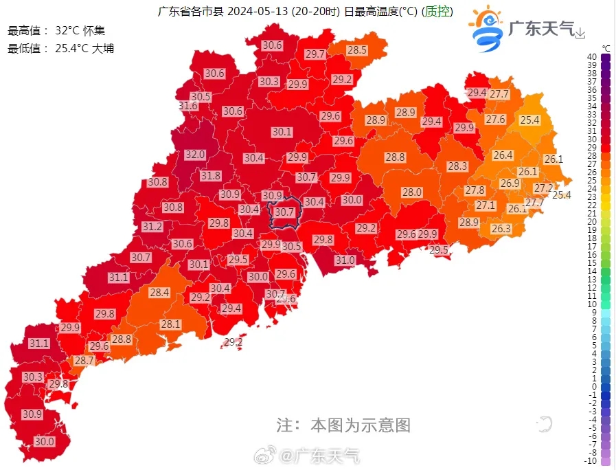 昨日(13日)廣東最高氣溫32℃(懷集)