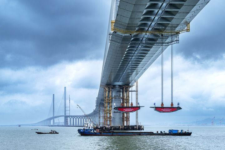 黃茅海大橋最后一片鋼箱梁吊裝現(xiàn)場(chǎng)。(廣東省交通集團(tuán)供圖 )