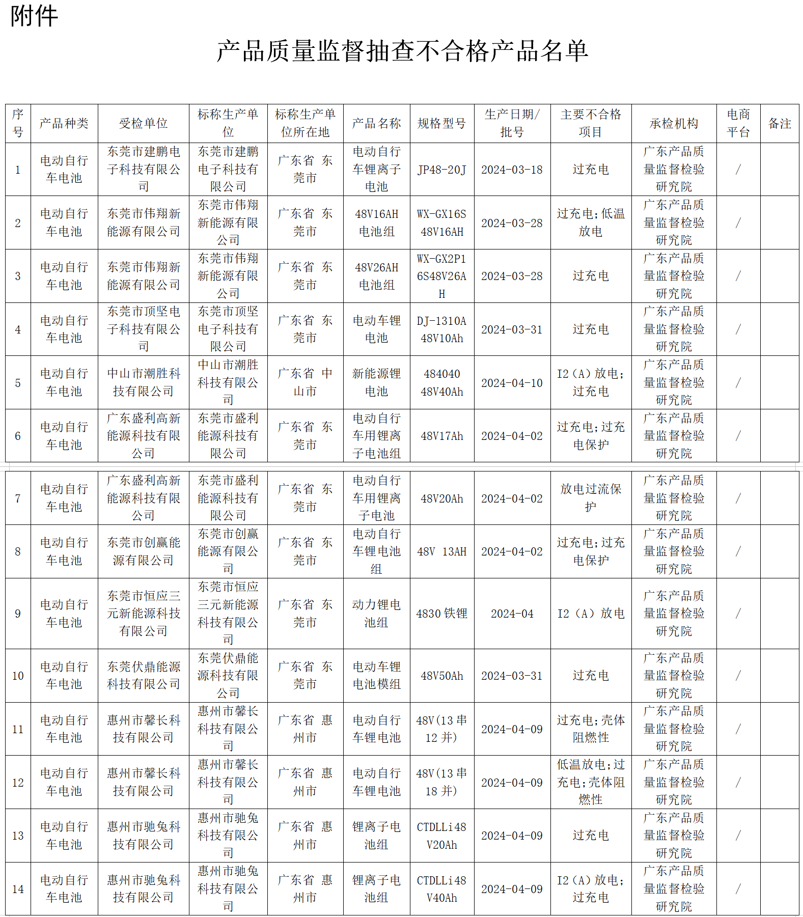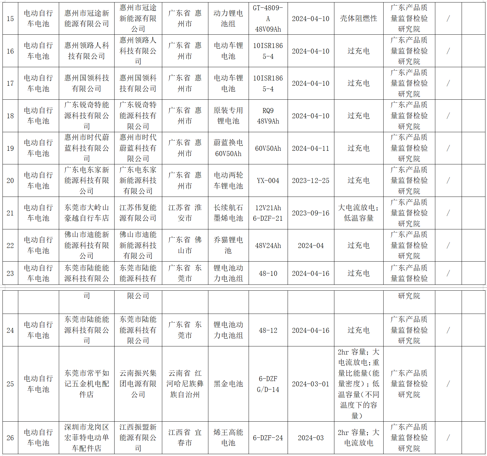 7月24日,廣東省市場監(jiān)督管理局發(fā)布通告稱,經該局組織開展的2024年電動自行車電池產品質量專項監(jiān)督抽查,共發(fā)現(xiàn)不合格產品26款(詳見附件圖片),其中生產領域不合格產品23款、流通領域不合格產品3款。