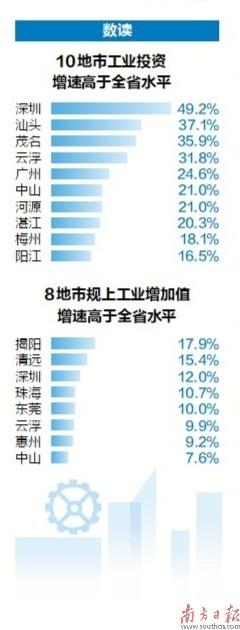 具體到各地市,深圳(49.2%)、汕頭(37.1%)、茂名(35.9%)、云浮(31.8%)、廣州(24.6%)、中山(21.0%)、河源(21.0%)、湛江(20.3%)、梅州(18.1%)、陽江(16.5%)10個(gè)地市的工業(yè)投資增速均高于全省水平。