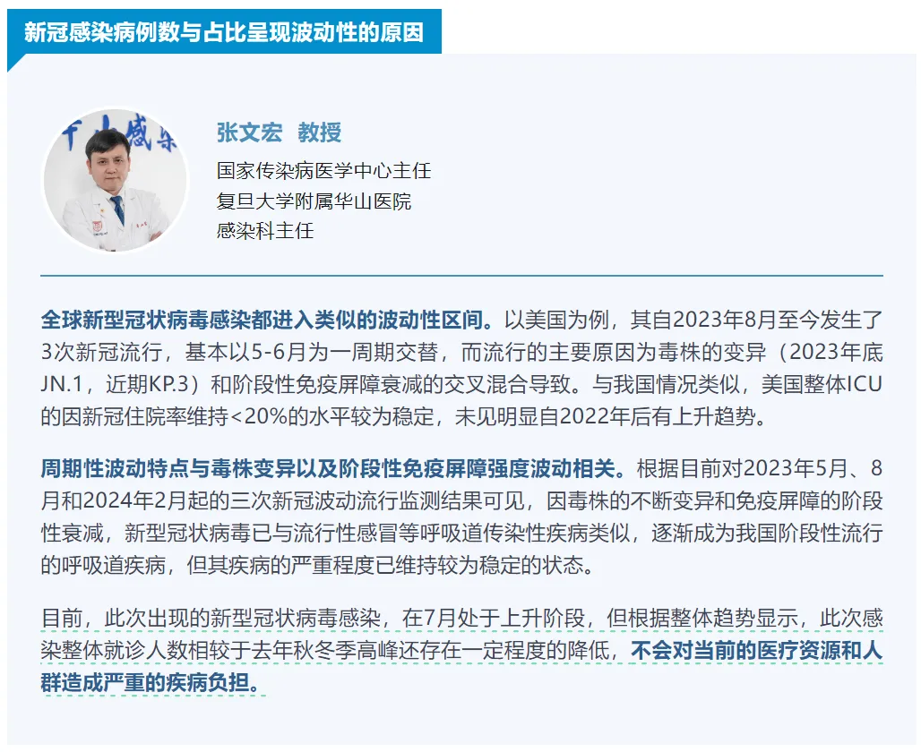 國家傳染病醫(yī)學中心監(jiān)測平臺對新冠奧密克戎毒株的變異與波動監(jiān)測顯示,自6月上旬起逐漸檢出新冠XDV.1和KP.2變異株后,XDV.1的比例已經(jīng)逐漸上升至40%-50%,但是這些變異株未引起重癥病例的升高。